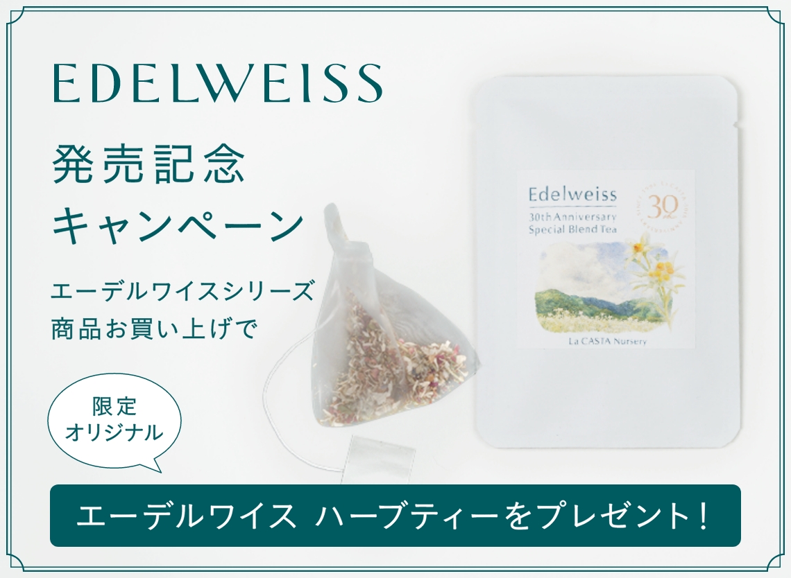 発売を記念して、エーデルワイスシリーズ商品をお買い上げで、限定オリジナルブレンド エーデルワイスハーブティーをプレゼントいたします。