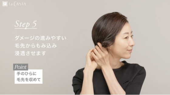 2. ダメージの進みやすい毛先からもみ込み浸透させます。